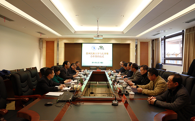 3月24日,贵州民族大学与贵阳孔学堂文化传播中心共建“黔学研究院”签约仪式在孔学堂勤事堂第一会议室举行。