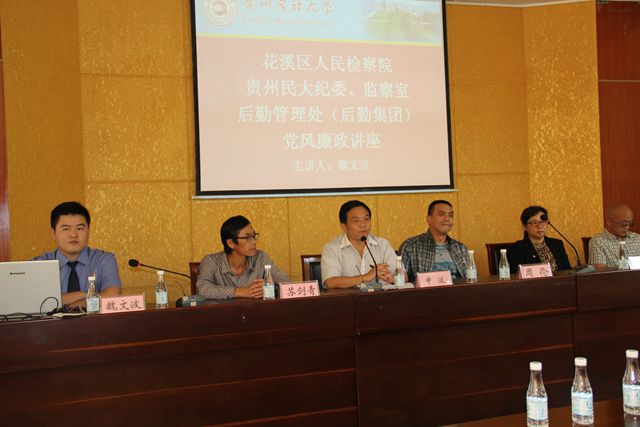 2015年10月29日,花溪区人民检察院、我校纪委、监察室、后勤管理处(后勤集团)联合举办党风廉政讲座,后勤管理处(后勤集团)全体员干部,入党积极分子等60余人参加讲座。出席本次讲座的还有花溪人民检察院副党检察长周伦、预防局局长苏剑青、预防局干警魏文波、校纪委、监察室主任蒙宁华、后勤管理处(后勤集团)主持工作申波副处长、王兴东副处长等。