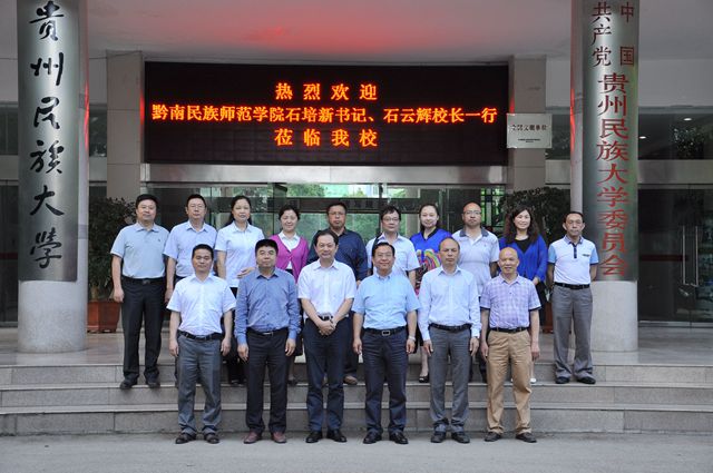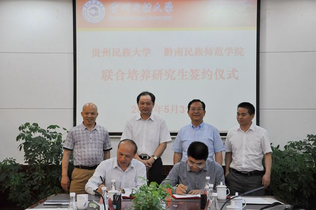 5月31日,贵州民族大学与黔南民族师范学院就联合培养研究生举行签约仪式。贵州民族大学校领导张学立、陶文亮、杨昌儒,与黔南民族师范学院校领导石培新、石云辉、黄胜共同出席签约仪式,两校相关部门负责人参加。仪式由贵州民大副校长杨昌儒教授主持。