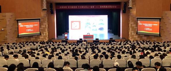 为深入学习宣传贯彻习近平总书记在北京大学师生座谈会和纪念马克思诞辰200周年大会上重要讲话精神,近日教育部办公厅印发了《关于组织开展“学习新思想 千万师生同上一堂课活动”的通知》,按照省委教育工委、省教育厅统一部署,6月14日,“学习新思想 千万师生同上一堂课”贵州民族大学专场宣讲会在大学城校区学生活动中心礼堂举行。校党委书记张学立教授,校党委副书记、校长陶文亮教授分别作了主题宣讲,贵州航空职业技术学院党委书记柴艳彪、党委副书记张萍出席,贵州民族大学、贵州民大人文科技学院的处级干部和师生代表,贵州航空职业技术学院师生代表共1000余人参加。 校党委副书记张鹏程主持宣讲会。