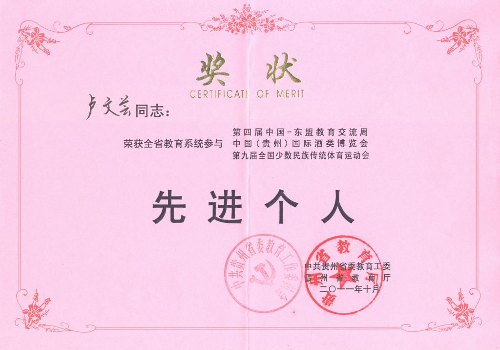 全省教育系统参与“中国东盟会、酒博会、九运会”先进个人证书—卢文芸