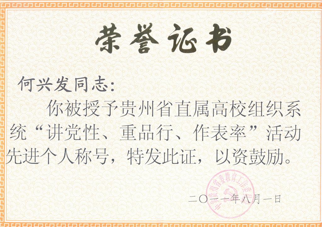 全省高校组织系统“讲党性、重品行、作表率”活动先进个人证书—何兴发